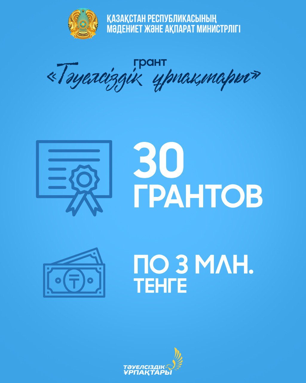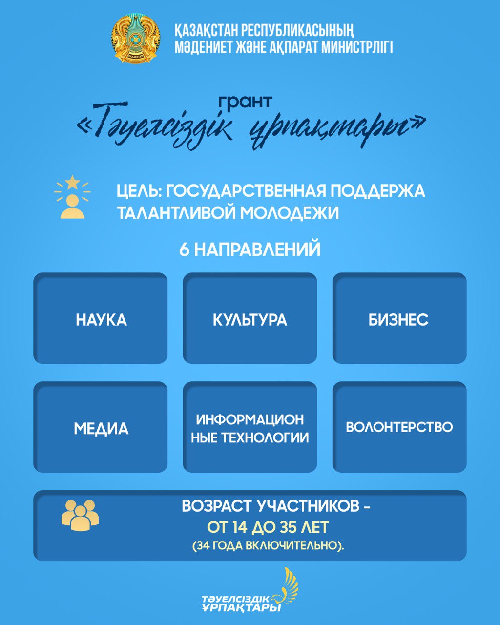 Грант предоставляется по 6 направлениям («Наука», «Культура», «Информационные технологии», «Бизнес», «Медиа», «Волонтерство»), претендентами могут стать граждане Республики Казахстан в возрасте от 14 до 35 лет (до 34 лет включительно).